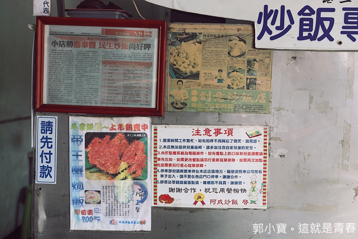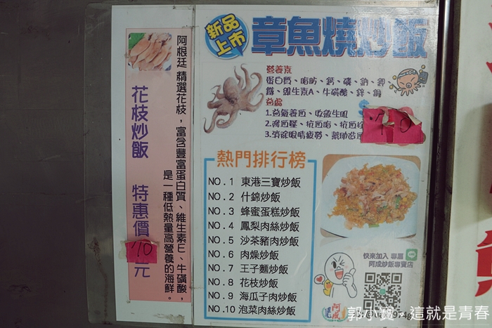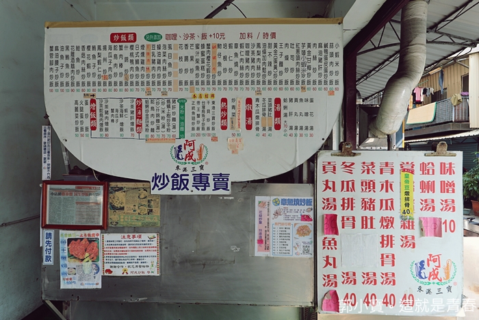 | 我們這次的目標就是阿成炒飯專賣店的鎮店之寶東港三寶炒飯,老實說我真的都沒吃過她的鎮店之寶,東港三寶炒飯介紹真的讓我們搞了一個烏龍,我看到這個還跟朋友說東港三寶是,魚子蝦、鮪魚花跟黑油櫻,一整個都看錯了啦XDD |