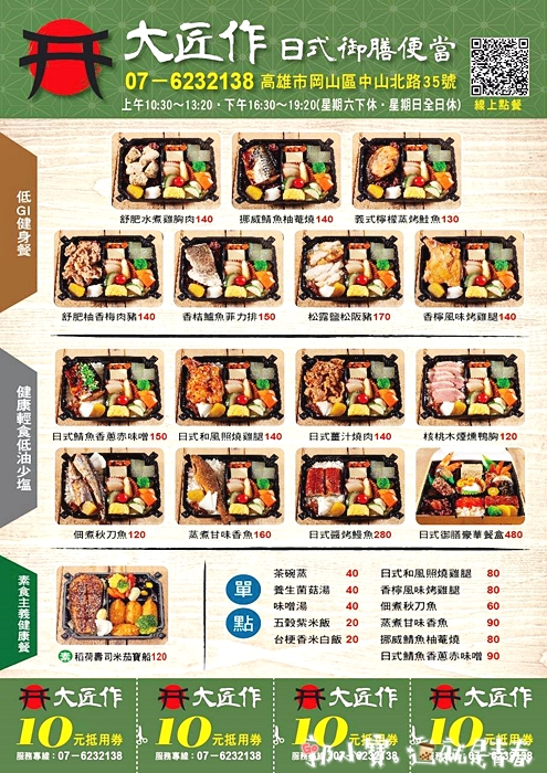 | 整體來說大匠作真的很值得推薦給大家,如果你有在健身的話,建議你可以選擇他們家低GI系列的便當,想要輕食無負擔可以選擇健康輕食系列,每一種系列都有很多口味,讓你天天吃健康也不會膩!!!! |