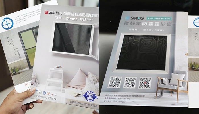 Poll-tex®靜電防霾紗窗網路上最多人推薦,給的官方數據跟有效證明也最多,當然價格也高一些些,不過一開始我就鎖定要裝它們家的,因為很久以前我第一次知道防霾紗窗就是他們家的,也有問過身邊幾個有安裝的朋友,給我的反饋都說很值得!!!