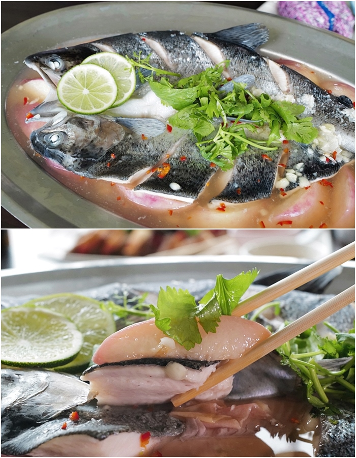 | 同樣由復興區養殖的鱒魚,拉拉山線上的餐廳大多很多使用鱒魚,主要當地養殖的鱒魚肥美沒有土味,用太是檸檬魚的做法再加上水蜜桃,味道確實特別,酸酸甜甜的,有泰式檸檬魚的底子,搭配水蜜桃的香甜,讓人胃口大開。 |
