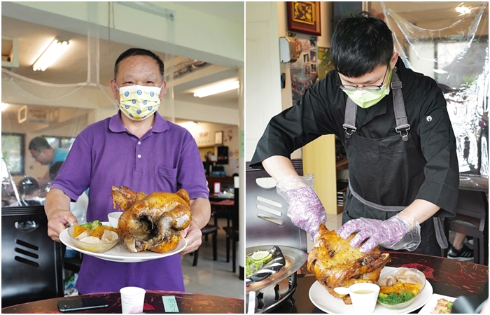 烤雞是餐廳父子兩的招牌商品,也是上了烤雞才知道,原來現在的廚房大廚是老闆的兒子,而且水蜜桃水果風味餐也是小老闆一手企劃,慢慢是了很久才推出。