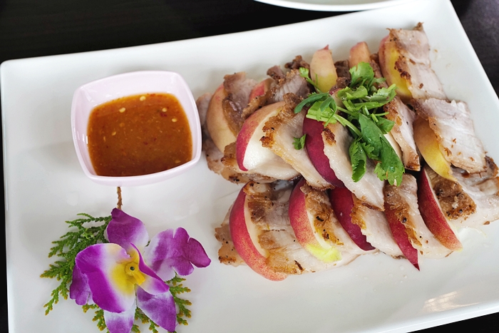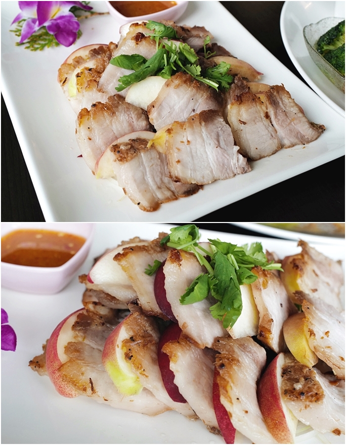 | 香茅豬肉本身就還滿好吃的,肥而不膩,瘦肉跟肥肉的比例處理的很好,有點像是泰式的作法,再搭配一片水蜜桃入口,清爽了許多讓整體的口感跟味蕾更加豐富。 |