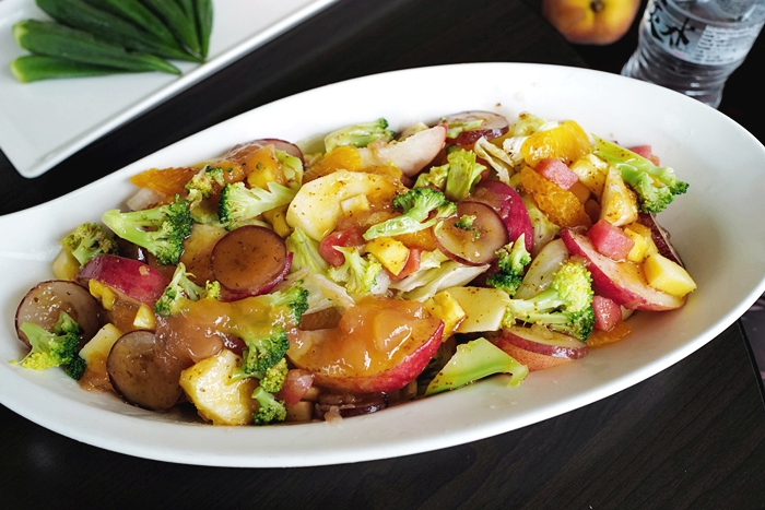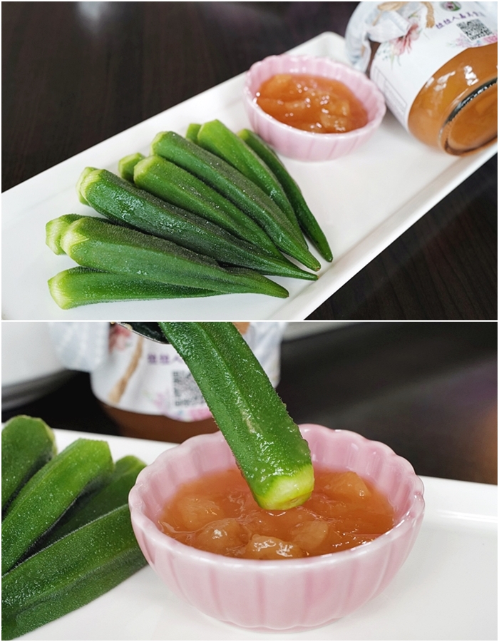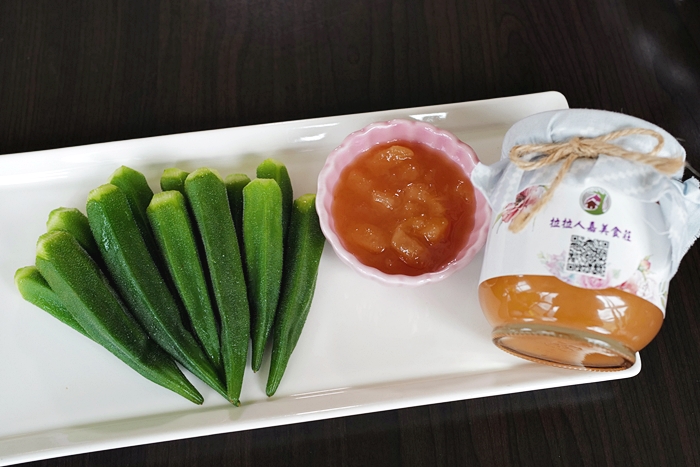 | 秋葵是很多人不敢嘗試的時候,但是秋葵沾上蜜桃醬真的很不錯,就連不敢吃秋葵的Cola都覺得很好吃,蜜桃醬的效果發揮得很好。 |