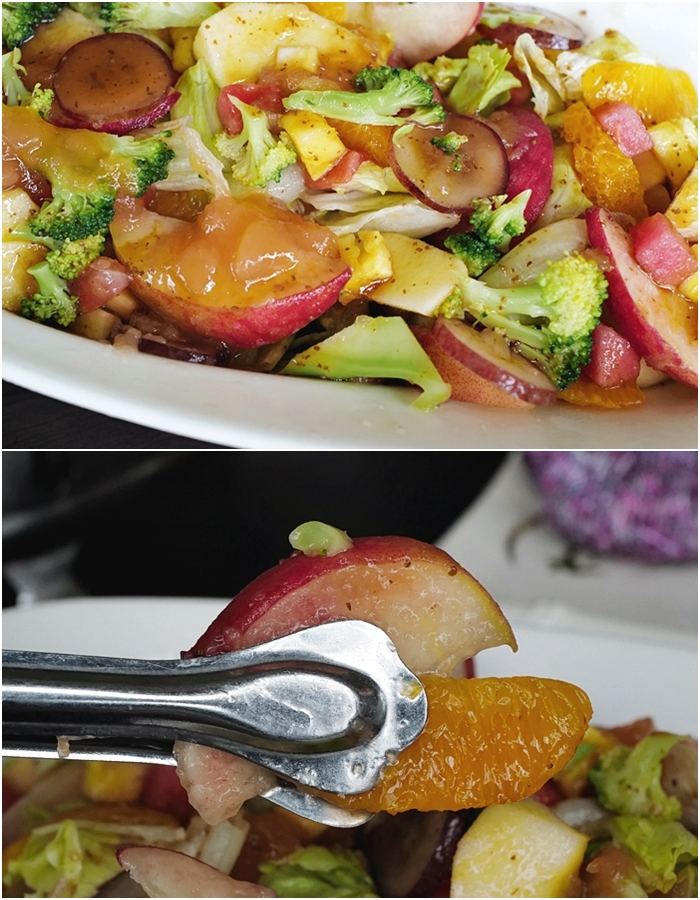 | 生菜沙拉除了一般的蔬果以外,多了爆汁的水蜜桃,再淋上自製的蜜桃醬,一整個陷入水蜜桃的世界裡面,吃起來相當不錯,有別於一般的生菜沙拉的爽口,多了水蜜桃的爆汁香氣。 |