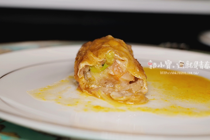 | 這一道料理我也滿喜歡的,湯頭據說是用龍蝦高湯去煨腐皮蝦卷,邁相看起來非常不錯,香氣也十分濃郁。 |