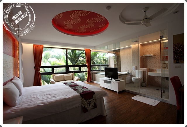 窗外看出去有熱帶叢林的FU,感覺深在遠始森林中,非常棒的感覺,浴室的隔間是剝哩!!