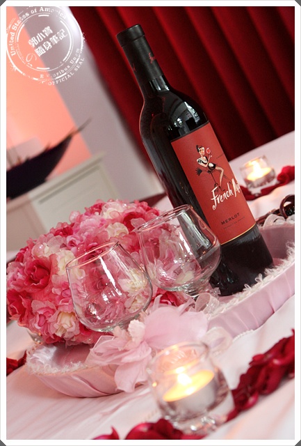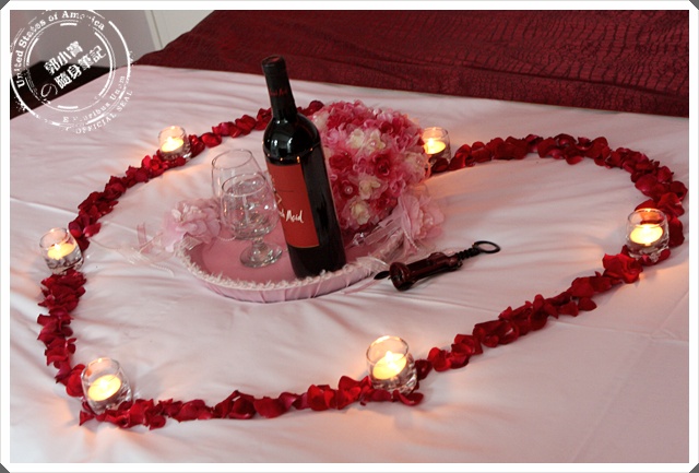 夠浪漫了吧!!心型玫瑰花瓣加上燭光,加上紅酒,這樣還不加溫才有鬼了 |