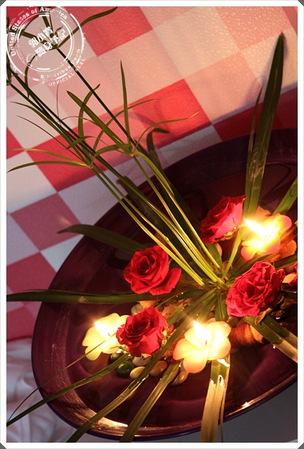床頭櫃旁也放了一盆造景玫瑰花盆,一樣點上燭光浪漫到一個不行,