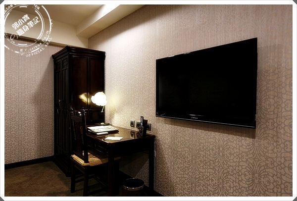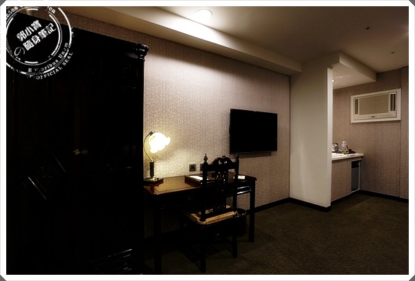 | 衣櫃跟書桌也是木質雕刻,感覺都好像是骨董家具來的,液晶電視是掛壁式的,沒有很大台,最旁邊就是茶桌跟冰箱了。 |