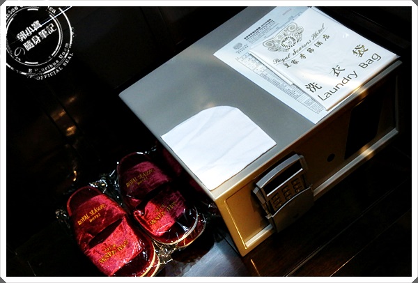 | 衣櫃裡面有著數位電碼的保險箱以外,拖鞋也是放在櫃子裡面的,大紅色的室內拖鞋還滿少見的。 |