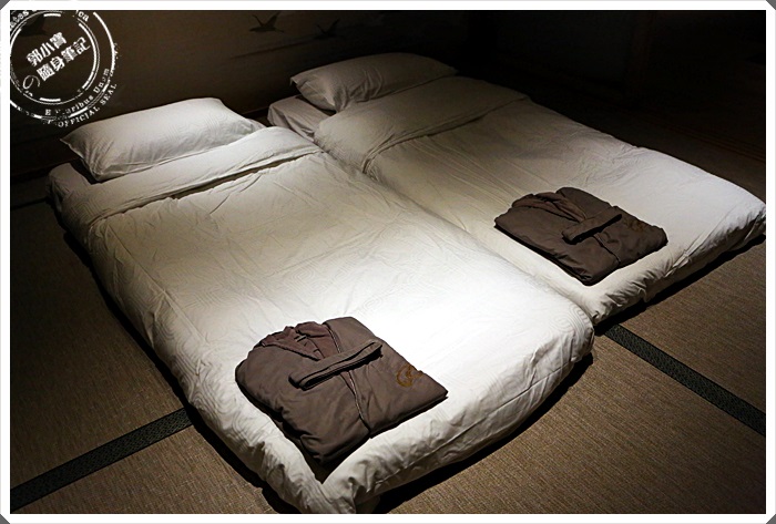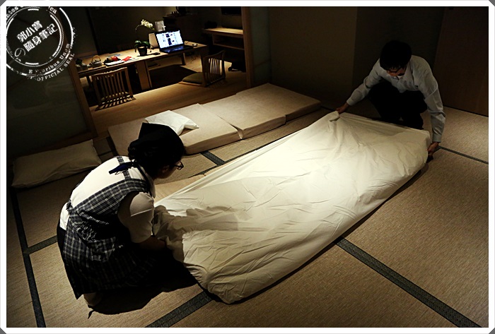 | 吃完後餐剛好遇到工作人原來鋪床,感覺超專業的,但是兆品的床還是跟日本有些不一樣,兆品的床基本上比日本厚了一些,可能是怕台灣人還是睡不習慣日本的軟墊,兆品的墊子再厚了許多,鋪好床的時候還附上了一件浴衣,穿起來的質感相當的好,枕頭我是覺得太軟了,但是因為是和室,所以似乎沒有其他枕頭的服務需求,但是想了一下應該是有,只是我不好意思打電話去櫃檯詢問XD |