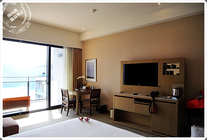 | 一進到房間後我們就開始大叫了,倒也不是因為房間的關係,因為房間都還沒仔細看就先看到窗外的大陽台,幾乎是丟下行理就往陽台奔跑去了,來這邊不就是要享受藍天碧湖的悠閒時光嗎? |