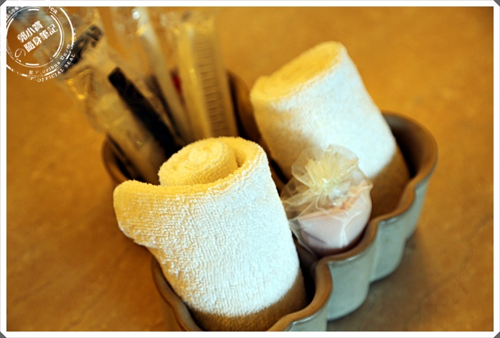洗手台上放了盥洗的備品,擦手巾也放在一起。