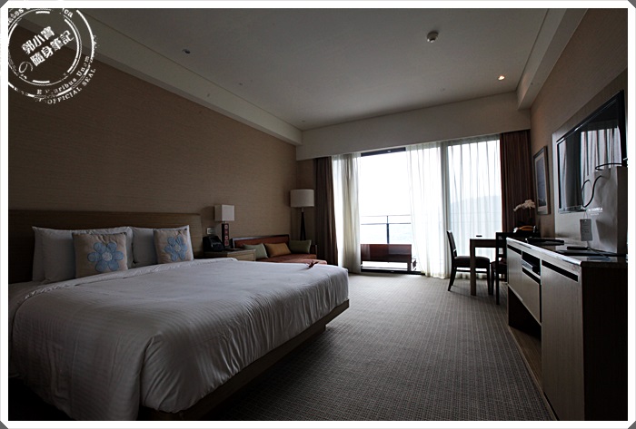 | 非要等到拍完陽台外的美景後我們才回到主題,房間內的空間還滿大的,除了有一張加大的雙人床以外,還有一組沙發,地上鋪的是長短地毯,踩起來非常的舒服,除了沙發跟床以外的空間,幾乎還可以放上兩個大行李箱,就知道房間有多大了,但是因為現在台灣的法令最低冷氣只能調26度,所以要等一下子後冷氣才會有感覺。 |