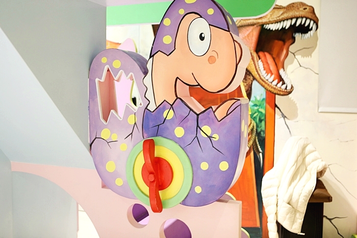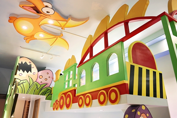 | 就連天花板壁燈都是滿滿的可愛恐龍,除了門口牆壁旁的暴龍以外,其他的恐龍都是可愛版的。 |