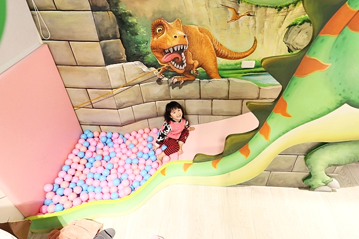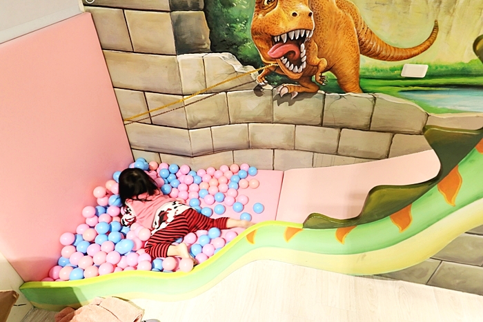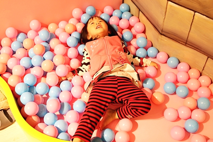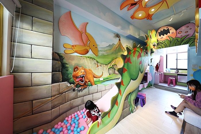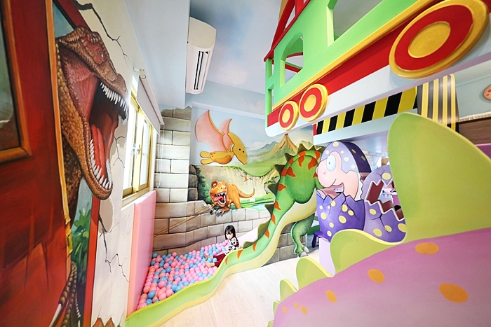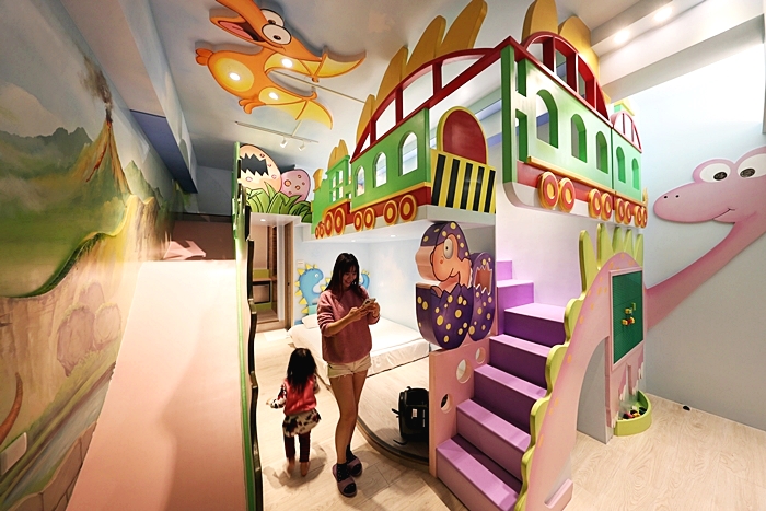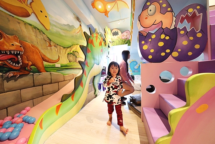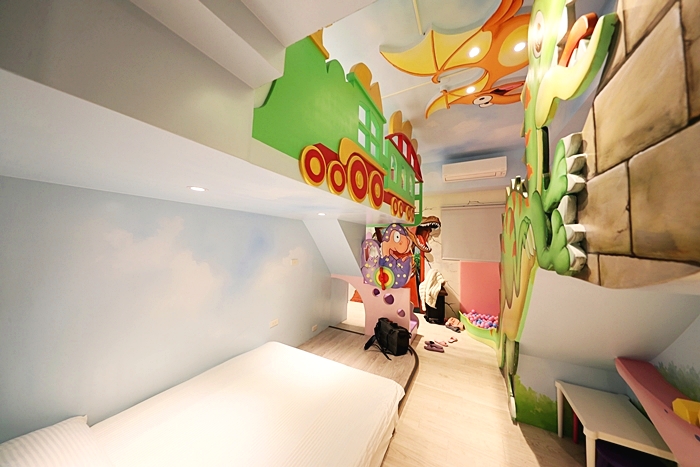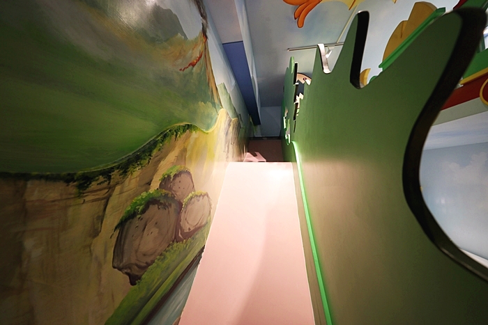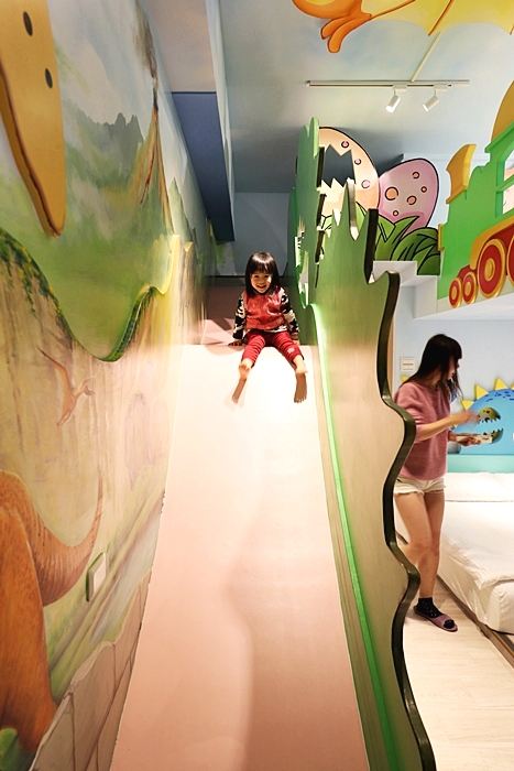 | 整個房間最主要都是木工裝潢拼湊出來的,搭配超可愛的彩繪,還有一座溜滑梯,房間裡面有溜滑梯真的很吃香,讓喜歡留溜滑梯的COLA一整個狂溜到不要簿耀的,滑梯的下方是一座小球池。 |
