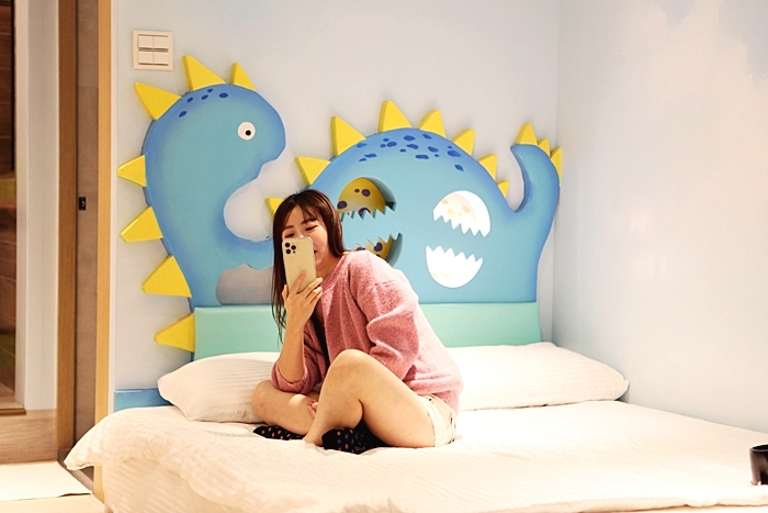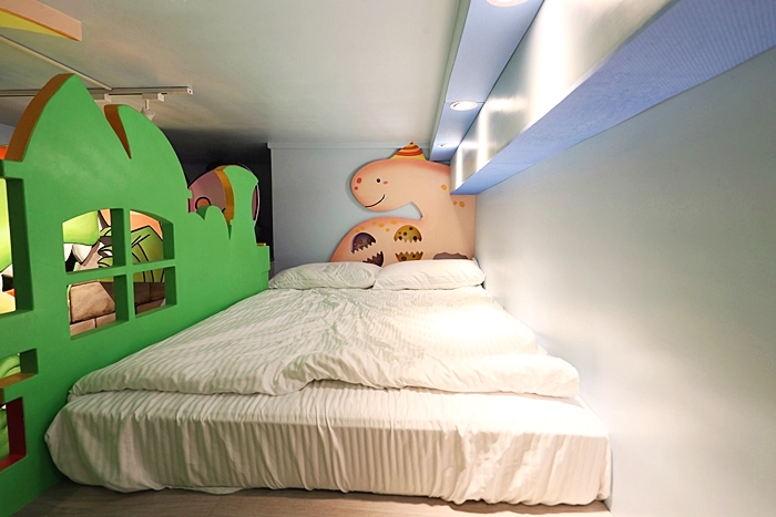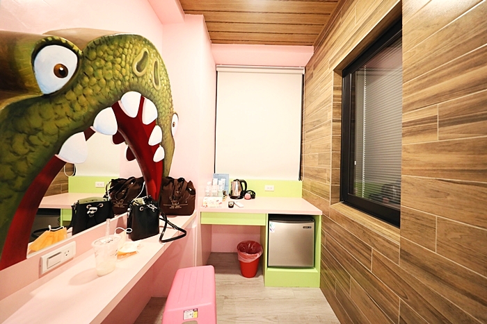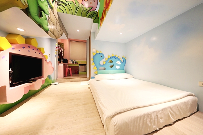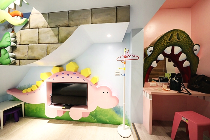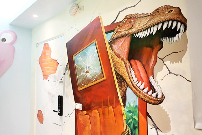| 我們住的是恐龍房,但是這裡好像不只一間恐龍房,3D立體壁畫的恐龍好像要衝出來一樣,真的好有趣,整間房間都是由木工裝潢及後製彩繪上去的,做的還滿不錯的。 |