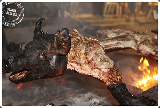 | 主辦單位為了讓大家吃得盡興,特別起了四個烤爐,有4-5隻山豬同時燒烤,老實說我就是在居酒屋那邊