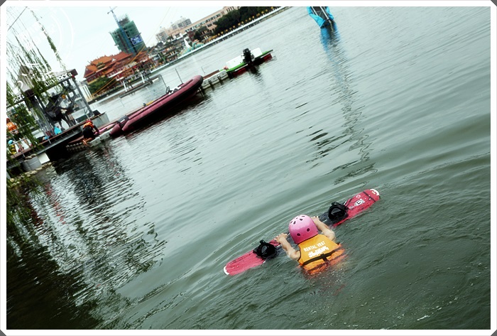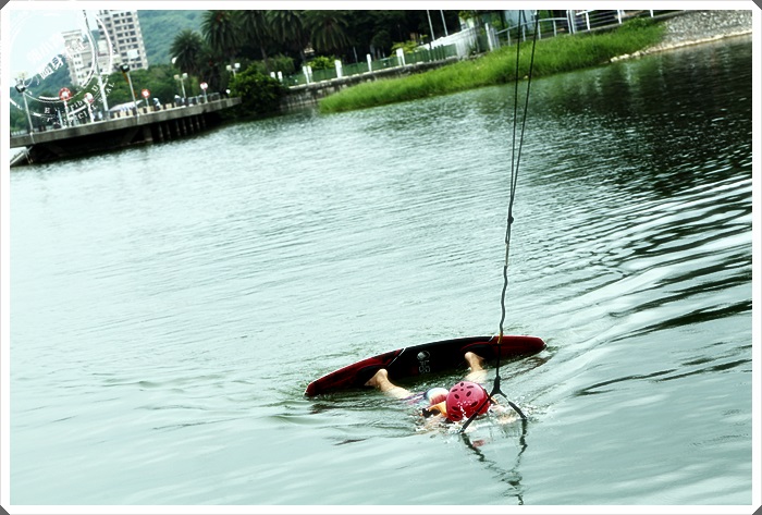 | 基本上只要能站得起來都可以享受到滑水的樂趣,但是滿多新手都先嘗試超人飛的快感,就是趴著抓緊纜繩,讓纜繩拖著你走就是超人飛了,可以在水平面上滑行的快感也很棒!! |