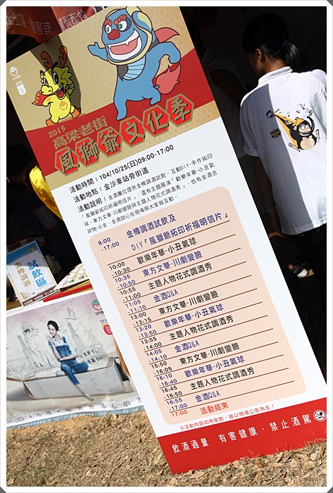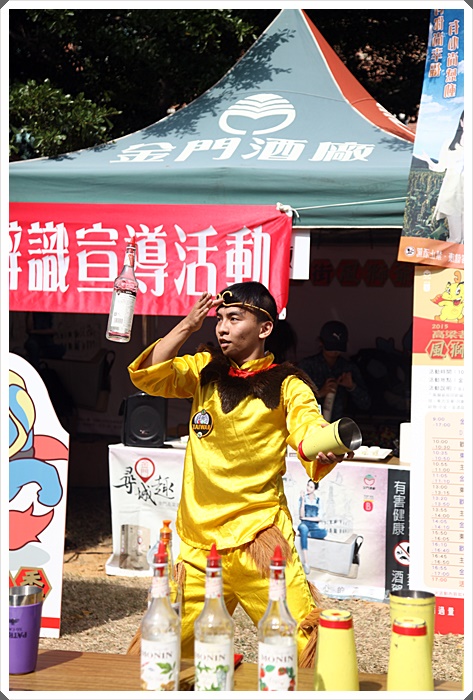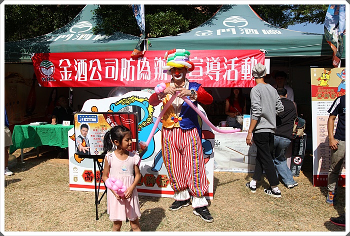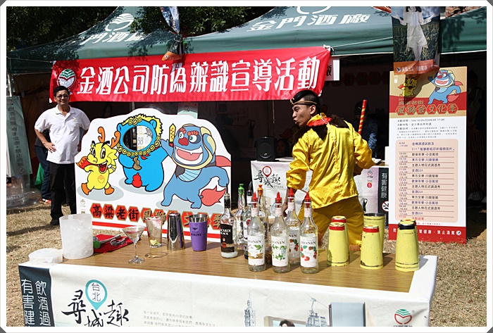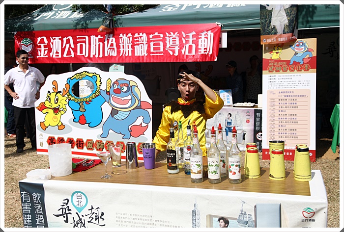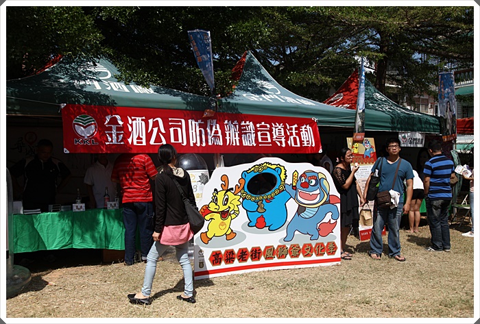 | 除了各式各樣的表演活動以外,另一個重頭戲當然是活動攤位的展示了,大部分金門各活動裡面就一定會看到金門酒廠的攤位,金門酒廠對金門各節慶及地方算是不遺餘力的支持了,取之金門回饋金門的典範,且每次金酒的攤位活動都相當的精彩,當天除了金酒的攤位以外,還有很多行政機關的攤位,宣導各式各樣的防護活動及安全認知,當中也有許多小吃攤位。 |