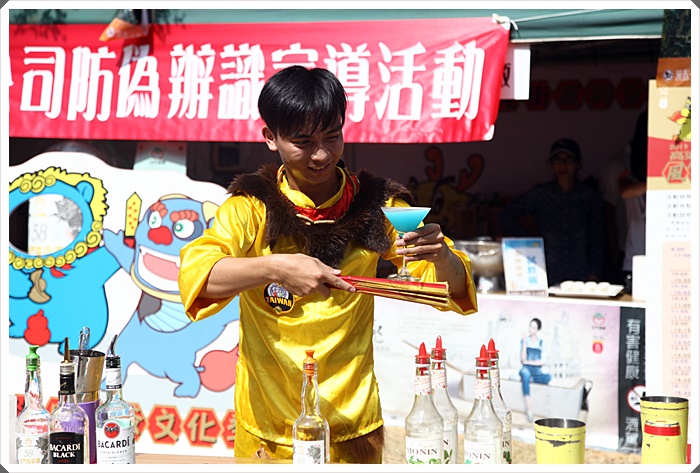 | 除了小朋友以外,當然不能錯過金酒的調酒系列,金酒大方的調出各式各樣的雞尾酒免費請大家品嘗,通常給人很刻板的金門高粱也可以很調酒。 |