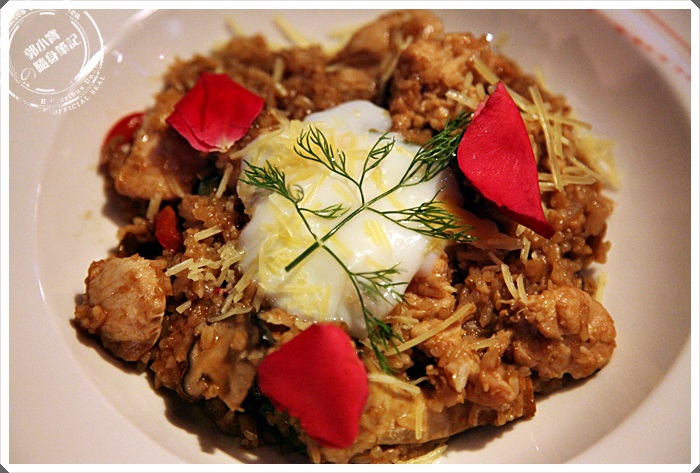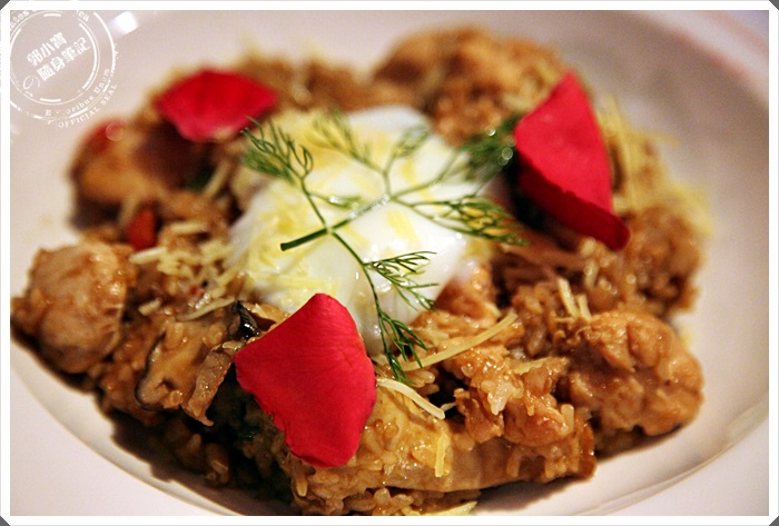 | 八號餐酒館的燉飯的比例老實說還不賴,燉飯的米粒介於台式燉飯跟歐式燉飯的中間值,不會太硬也不會太軟,外軟內硬算是我給他的平價,將蛋畫開後,蛋液流出後將它跟燉飯混和腳拌入口,濕黏的口感加上粒粒分明的燉飯,口感算是挺特別的,雞肉塊都還滿嫩滿大塊的,但是整體的味道上比較偏台式。’ |