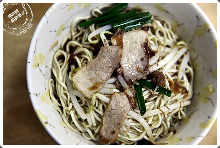 | 小小的一碗乾麵上桌相當清香,如同平常古早味麵店,幾片肉片根豆芽菜淋上肉燥。 |