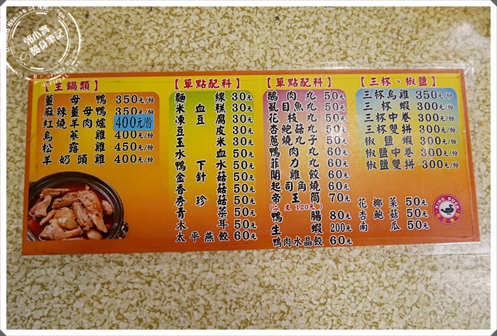 | 不只有薑母鴨,還有羊肉爐以及其他雞肉類的鍋物供應,讓客人有更多的選擇,帝王食補其實有許多的分店,但寶妹也是第一次品嘗帝王食補紅面薑母鴨系列,今天有些期待。他們供應的單點配料比其他家的薑母鴨種類還要多~ |