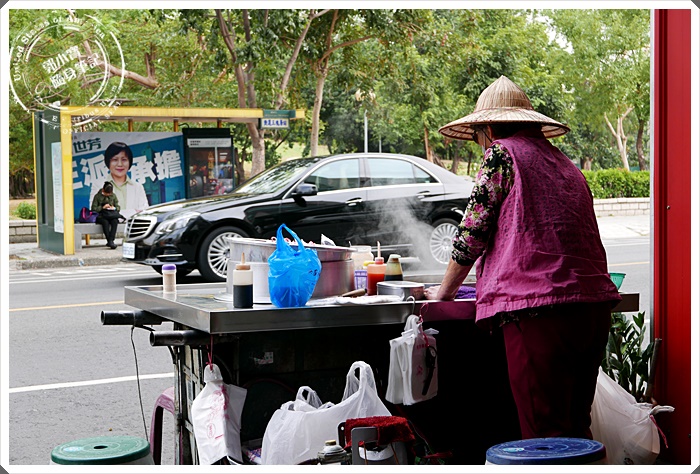 | 簡單的攤車就真的只有賣麵線羹而已,小碗40...大碗的忘了問價錢了SORRY!阿婆很可愛,其實攤車放在外面真的很曬,但阿婆都把騎樓下讓給客人當用餐區,自己戴斗笠跟時髦墨鏡防曬XDDDD,只能說阿婆很可愛啦~~~ |