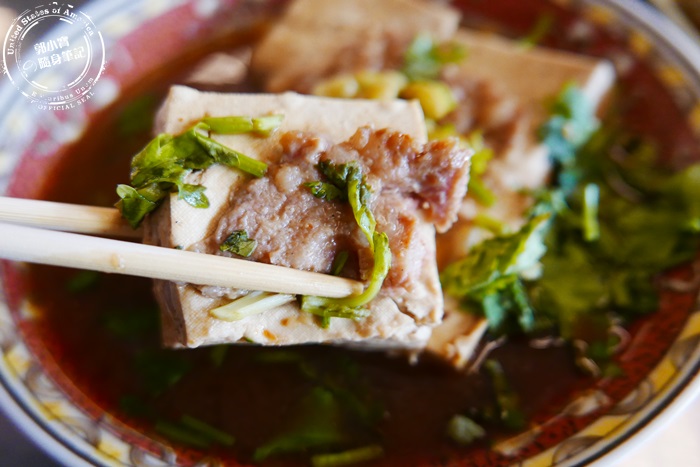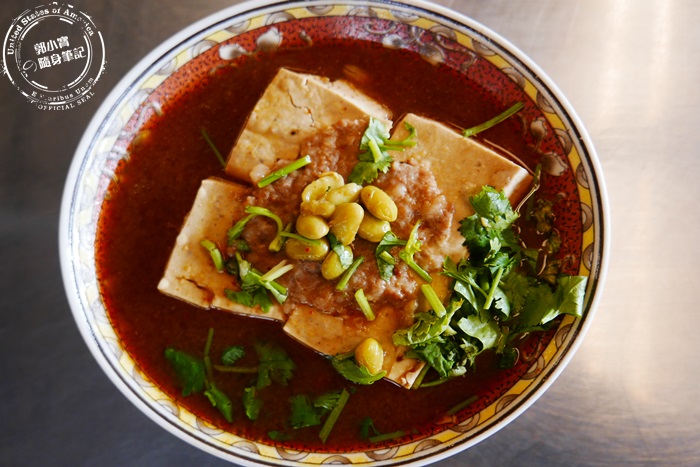 | 使用蒸籠烹調入味的清蒸臭豆腐,一口咬下軟綿濕嫩,加上香菜、豆子與豬肉末,增添口感層次,調味過的湯汁味道濃郁帶點微辣感,單喝也不覺得膩。 |