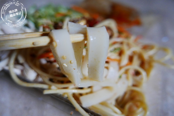 分別有義大利麵、蕎麥麵、板條、河粉,四種麵條一次滿足,配料滿滿的小黃瓜絲、雞絲、胡蘿蔔絲,還有白芝麻跟花生,配上麻辣醬汁,整個超豐盛超滿足。 |