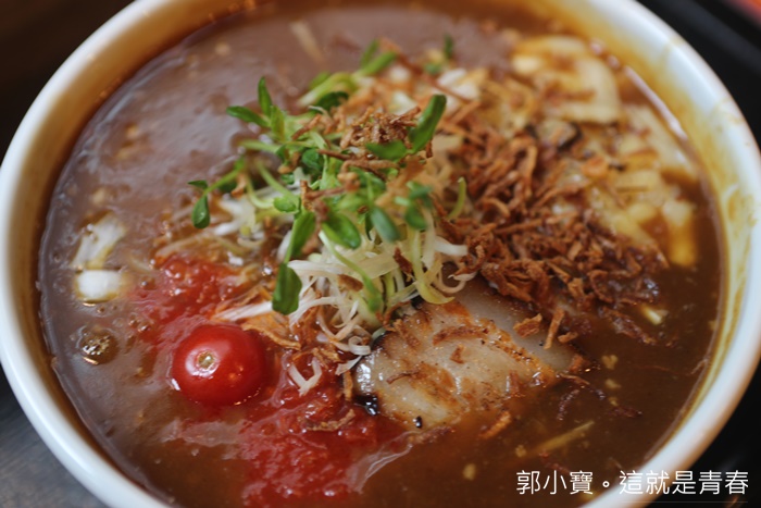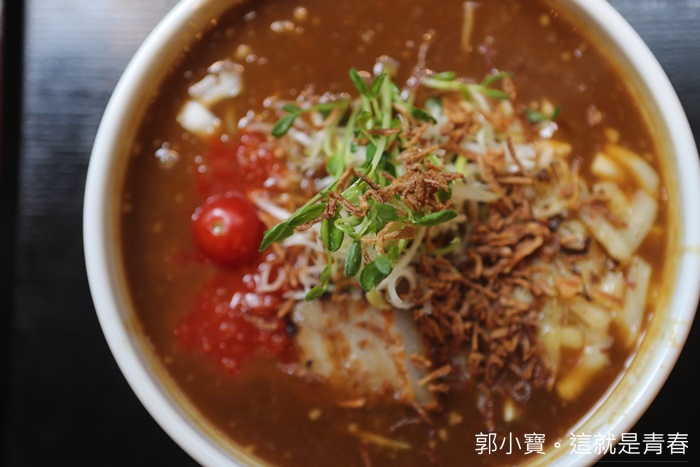 這一碗拉麵就是她們家的招牌,中文的名稱應該是咖哩起司番茄拉麵,這一碗拉麵真的太創新了,端上來的時候真的咖哩香氣撲鼻而來,一整個就是濃郁到爆了,看得我口水直流,但是可想而知鹹度跟口味應該都是超級重的。