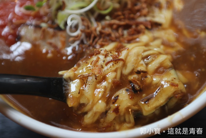 麵條都是細麵,吃的時候基本上非常半軟了,因為泡在咖哩裡面吸收了很多湯汁,每一口麵條都是濃郁的咖哩滋味,辣度因為起司的關係所以只會吃到咖哩香的辣口香氣,還有濃郁起司的滋味,真的非常特別的一碗拉麵,咖哩煮的有點濃稠,所以醬汁都會緊緊的巴在麵條上,建議要趕快食用,不然麵條爛得很快。