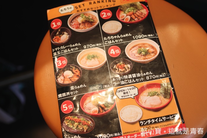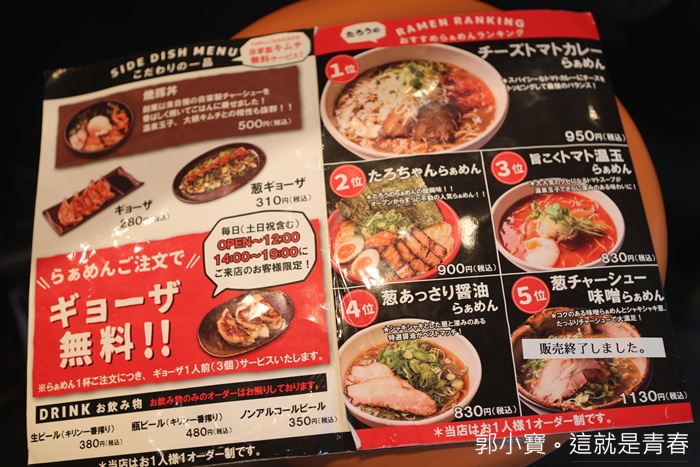 | 菜單的選項沒有特別多,但是據說樣樣都是招牌跟強打,圖片上還有標示人氣排行板,如果不知道吃甚麼的話,不妨跟著人氣排行板點吧,土曜日依照規定時間來用餐的話還有免費煎餃可以食用。 |