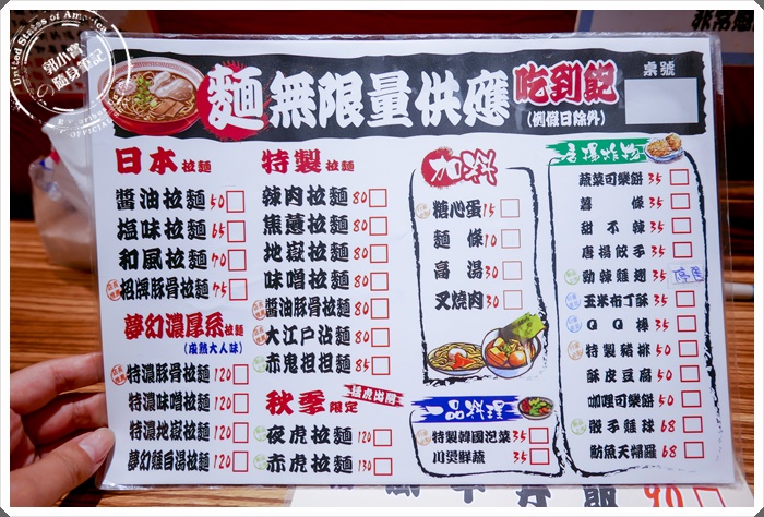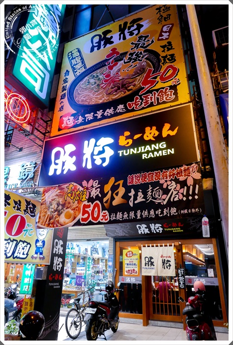| 誰說便宜沒有好拉麵!?說得好,寶妹原本要在對面享用海南雞飯的,不料竟然還沒六點半就已全部售完,退出來又下起了大雨,頓時覺得一陣涼意阿,秋雨連連天氣涼還被困在雨中= =忽然驚覺正對面有家日式拉麵店,鮮豔的招牌完全吸引了寶妹的目光,還強調50元拉麵吃到飽,沒走進去吃碗麵感覺對不起自己,趕快衝向店裡去~~ |
