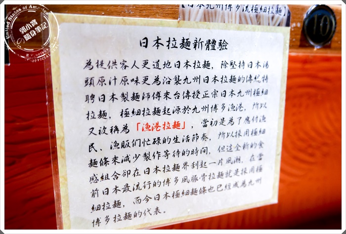 | 座位上都還有關於九州極細拉麵的小故事唷~寶妹自己是吃得很開心啦,整餐下來不用100元,下次想要挑戰辣味的哈哈! |