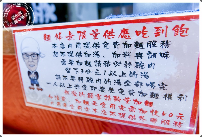 | 桌邊上還有貼著加麵的小規矩告知,加麵是限定平日才能夠加麵的唷!而且無法加湯跟調味,還一定要留有三分之一的湯頭在碗中,以上才符合加麵唷~ |