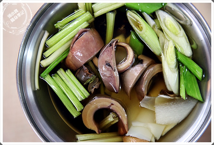 | 小火鍋是底下用酒精糕燃火的,加上有蓋子一下子就把火鍋悶熱了,這一款火鍋是我最喜歡的,可以吃到新鮮的魷魚,而且這邊的魷魚相當的鮮脆,螺肉口感也相當的棒,Q彈有勁,湯頭偏醬油湯頭,但是加上魷魚跟螺肉還有大蔥的烹煮,整體也是以偏甜為主,但是可以喝出這些食材的鮮甜,與柴魚高湯是完全不一樣的風味,裡面的魷魚與螺肉也滿多的。 |