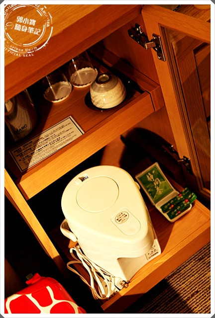 | 電視櫃下方有茶具組跟一個熱水器,水要去廁所裝,日本的水都很乾淨的,