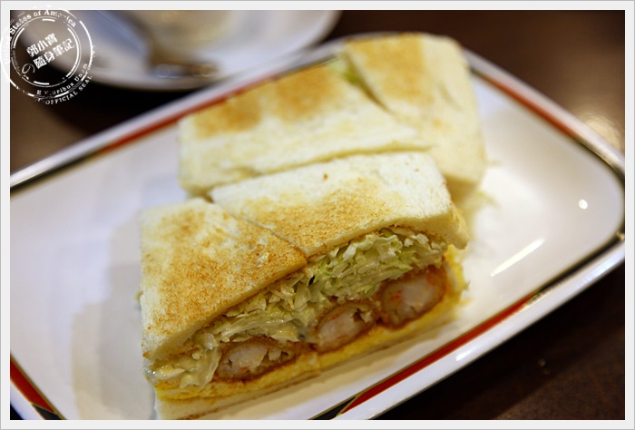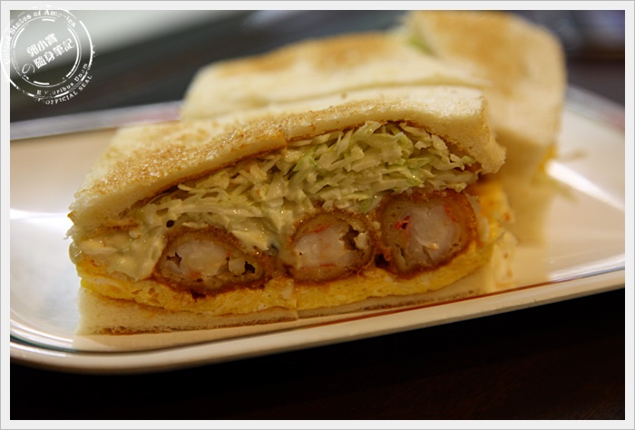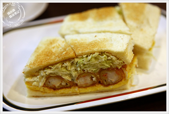 | 店家的招牌吐司,裡面一卷一卷的是蝦子唷,這高麗菜絲似乎比剛剛那一份還要多,咬下去的口感非常飽口且紮實,蝦肉卷的滋味非常好,搭配酥脆的土司一整個就是超級美味的,難怪可以成為店家的招牌商品,也很多人選擇外帶,感覺有點像是台灣洪瑞珍三明治一樣的明星商品,非常非常的推薦! |