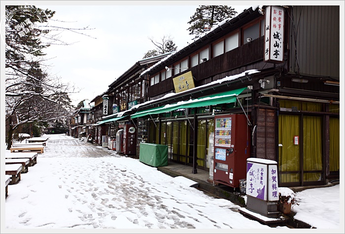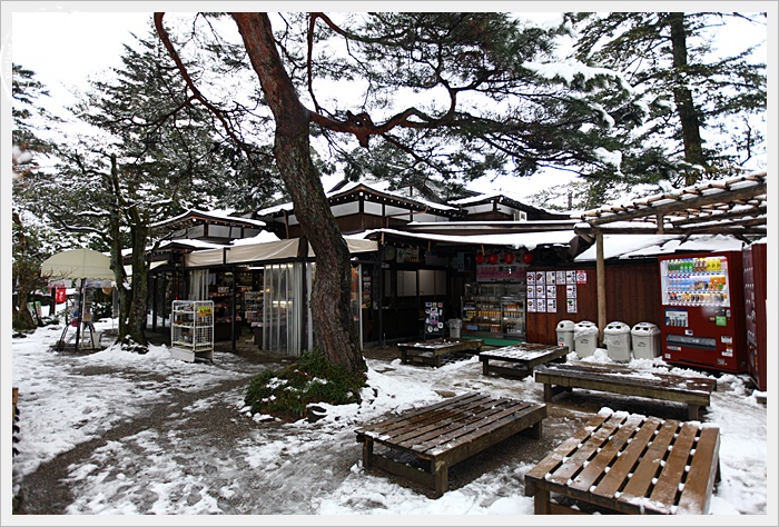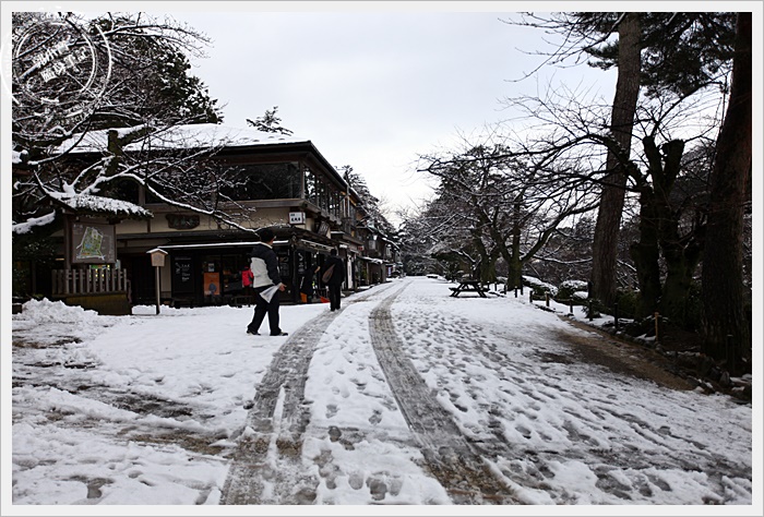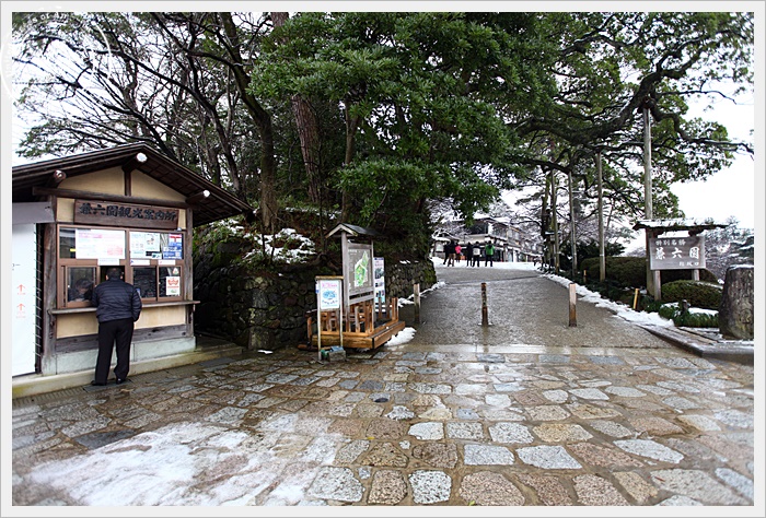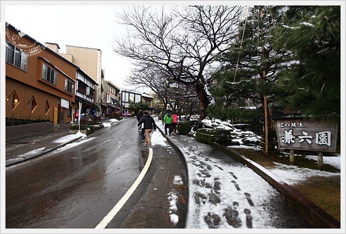 | 走了一小段上坡後才到達兼六園的入口,進入兼六園是需要購票的,旁邊的古街是兼六園外面的商店街,這邊一定要去品嘗一下最有名的金箔冰淇淋。 |