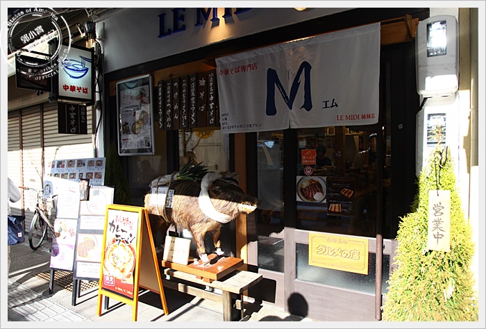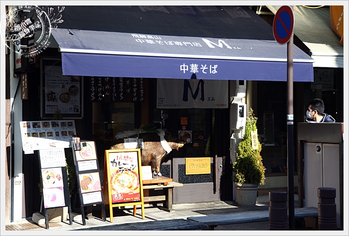 | 這一家拉麵店外觀非常顯眼,一下子就找到了,和牛拉麵店外面還放了一隻山豬的標本,搞得我好亂啊 |