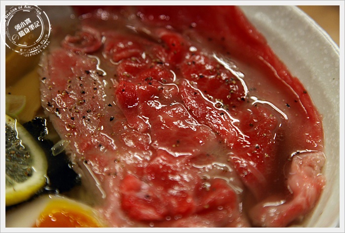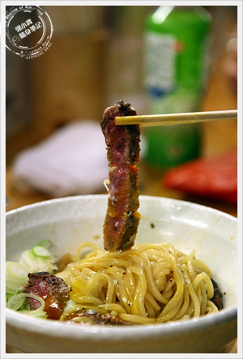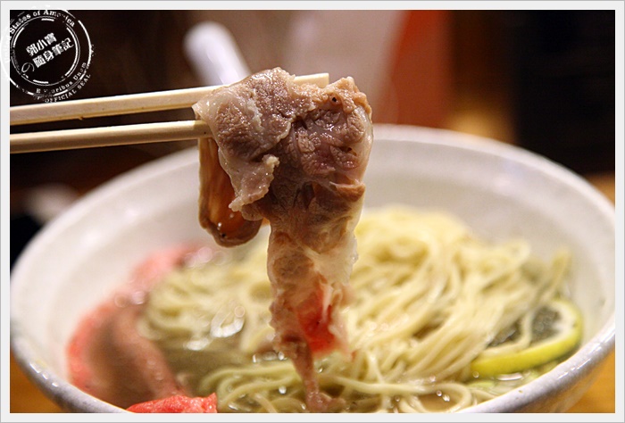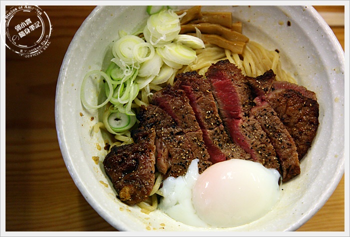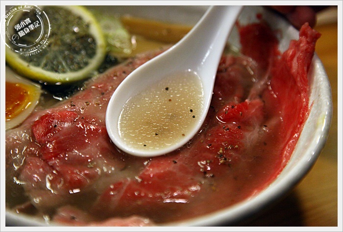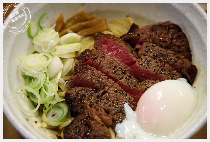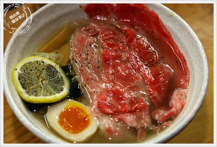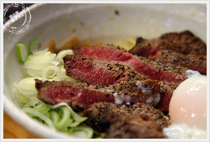 | 製燒過的A5飛驒牛里肌肉看起來就很糾C,一口咬下去瞬間感動,這大概是我吃過拉麵裡面最好的牛肉了,下面那一晚簡直都沒得比了,那放入口中咀嚼的嫩口香甜彷彿就會融化在嘴裡的感覺超級滿足,沾點半熟蛋黃液又是別有一番滋味。 |
