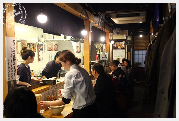 | 排了一會兒隊才進入店內,滿滿的人潮,店內空間不大,就只有板前桌大約10個人左右的座位,店內的工作人員才三個,忙進忙出的。 |