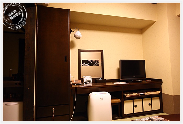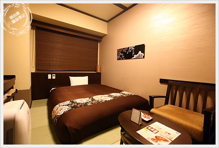 | 進入房門還覺得滿不錯的,雖然房間不是和式房間,但是比起一般的商務旅館來說空間差不多,但是裝潢上就頗有用心,讓人感覺還是帶點和式的氛圍感,床鋪腳下還有一張個人茶几跟椅子。 |