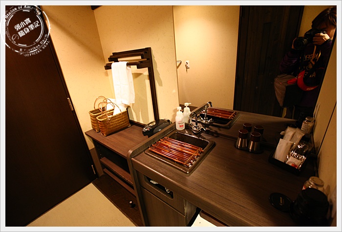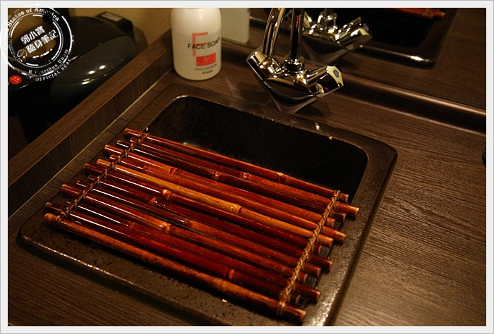 洗手台上還有一片竹子置中,讓水流沿著竹管滑落頗有禪風的意境。