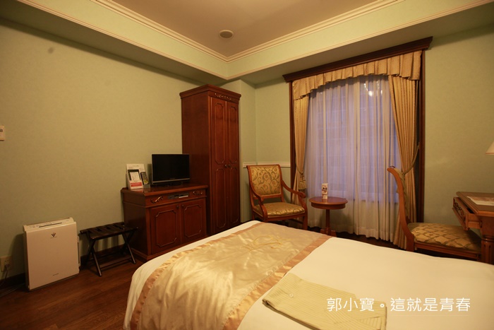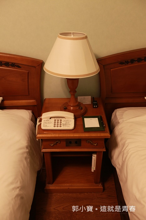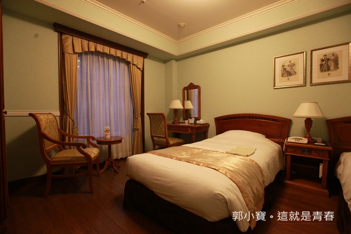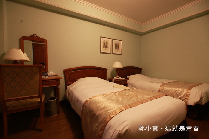 | 走進房間也是濃濃的歐洲風情,壁紙顏色有點像是蒂芬妮綠以外,我們的房型是兩張單人床的房型,古樸的感覺讓我還滿驚訝的,不管是床頭板還是桌子跟化妝檯都散發著濃郁的古典歐式風格。 |