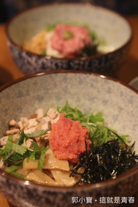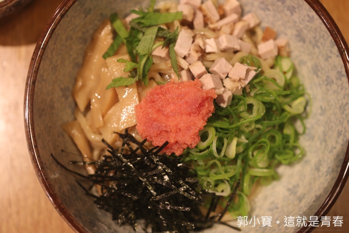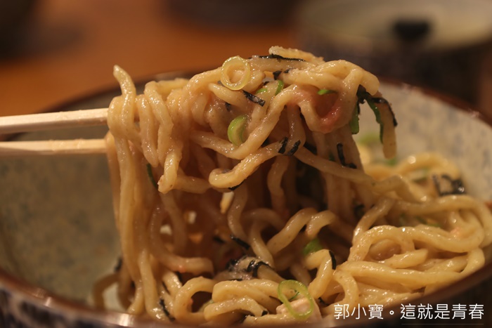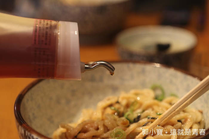 | 趕緊把麵拌開,如果覺得太乾的話可以加上青由,我覺得其實就是日本現在慢慢越來越多的油蕎麥,相對於台灣來說就是拌麵,麵條都屬於中太麵。 |