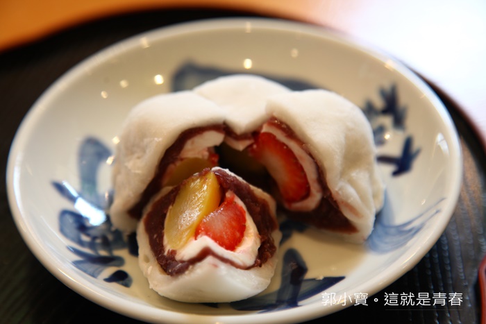 | 日高的大幅真的非常大顆,比一般的大幅大了許多,裡面除了兩款水果以外還有紅豆泥餡跟奶油,滿滿的四款餡料真的口味很豐富,一口咬下的口感很多重,好險我們是四個人分食,不然真的吃一顆大福會超飽的。 |