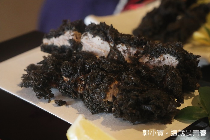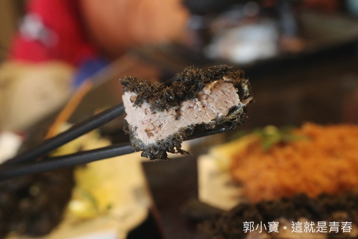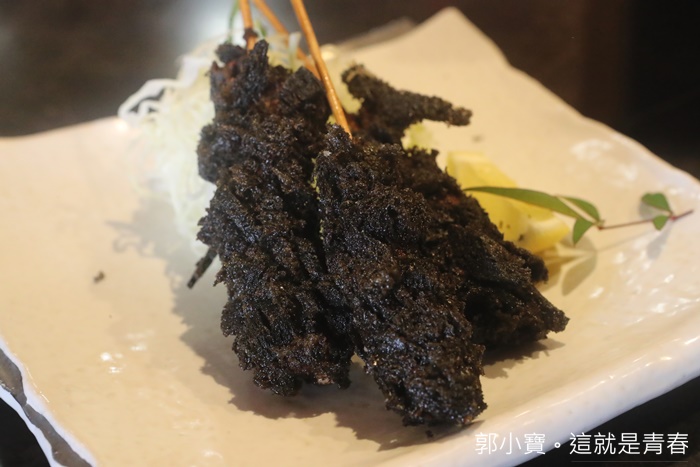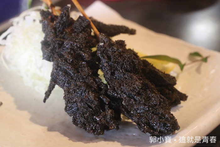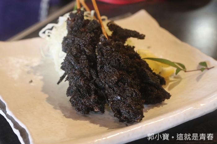 | 先來個豬肉串炸墊墊胃,個人覺得價位都在可以接受的範圍,甚至我覺得有點便宜,因為六白黑豚的價格真的還滿貴的,黑色的炸粉吃起頗酥口帶點油,彷彿放在嘴裡會慢慢的溶化的口感。 |